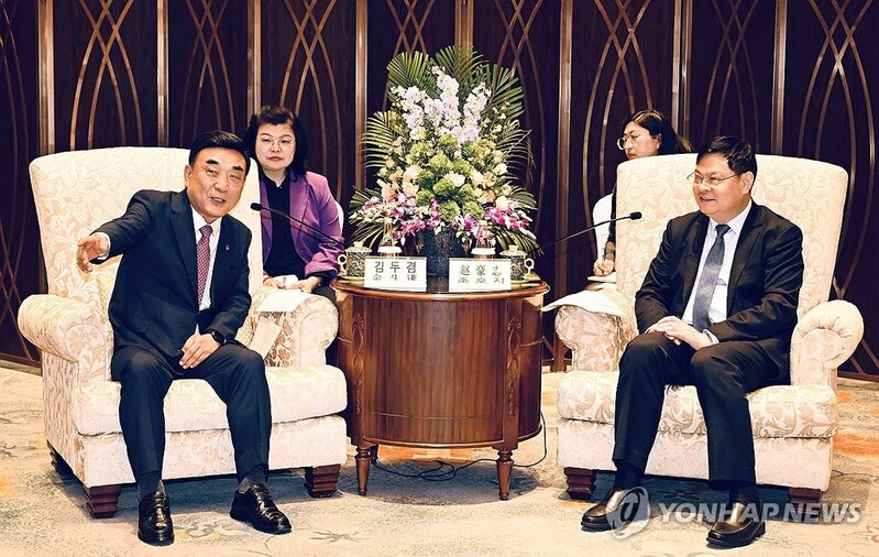 | ▲ 중국 칭다오시 시장과 면담하는 김두겸 울산시장 (울산=연합뉴스) 김두겸(왼쪽) 울산시장이 28일 칭다오시 샹그릴라호텔에서 자오하오즈 칭다오시 시장과 양 도시 간 우호 협력을 위한 면담을 진행하고 있다. 2024.5.28 [울산시 제공. 재판매 및 DB 금지] canto@yna.co.kr |