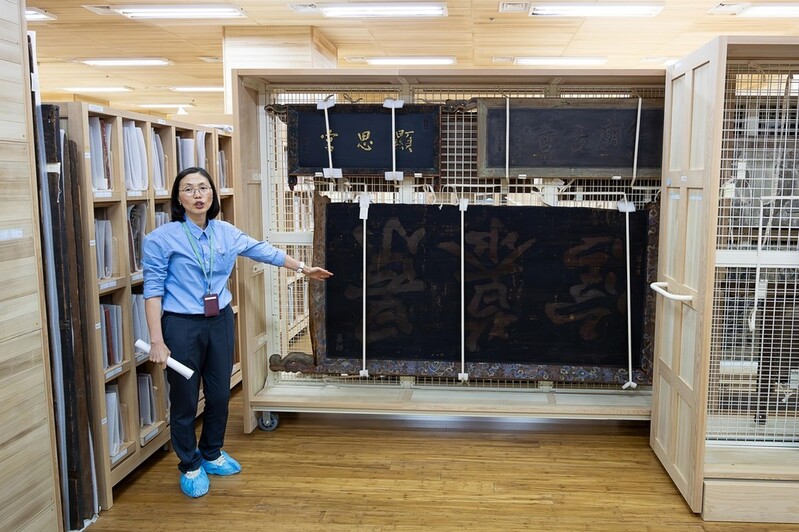 | ▲ 수장고에 보관된 궁중 현판 (서울=연합뉴스) 윤동진 기자 = 정소영 국립고궁박물관 유물과학과장이 5일 박물관 수장고에서 보관 중인 궁중 현판을 보여주고 있다. 2024.6.5