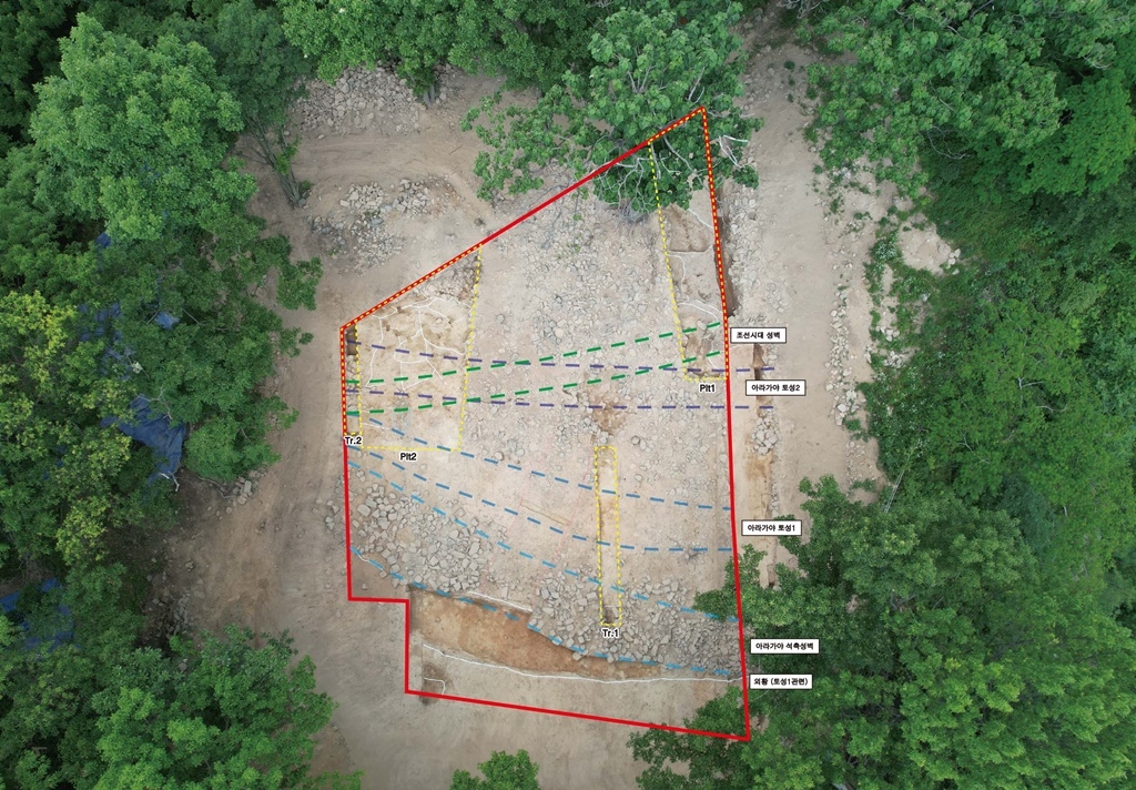 조사 결과 함안에 있던 가야왕국 아라가야 시기 축조한 토성벽과 석축 성벽, 조선시대 만들어진 석축 성벽이 확인됐다.