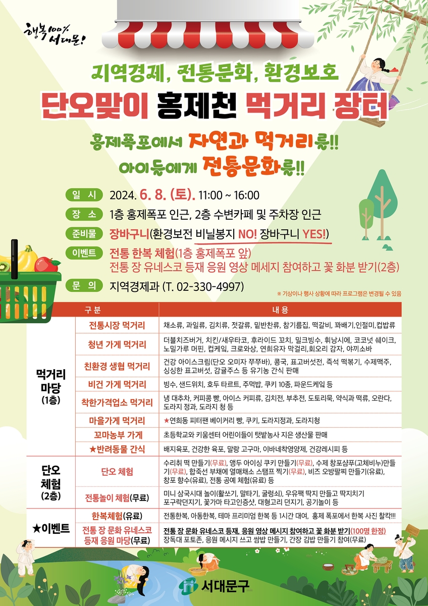 (서울=연합뉴스) 정준영 기자 = 서울 서대문구(구청장 이성헌)는 오는 8일 오전 11시부터 오후 4시까지 서대문 홍제폭포 광장 일대에서 '단오맞이 홍제천 먹거리 장터'를 연다고 4일 밝혔다.