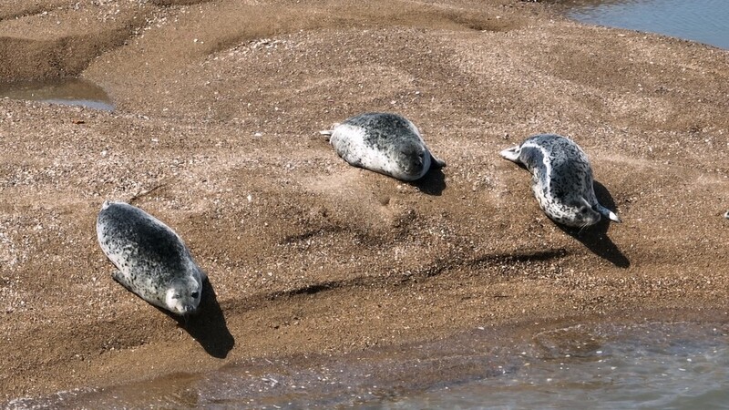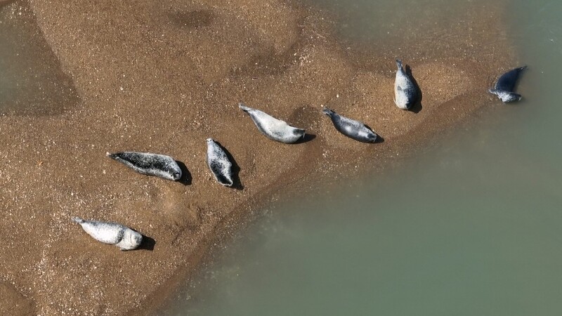 4일 서산시에 따르면 지난달 23일 대산읍 오지리 앞 넓은 모래톱에서 쉬고 있는 점박이물범 7마리가 촬영됐다.