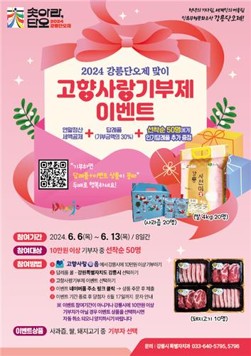 (강릉=연합뉴스) 유형재 기자 = 강원 강릉시는 '2024 강릉단오제'를 맞아 고향사랑기부제 활성화 및 기부 동참을 위한 온라인 기부 감사 이벤트를 실시한다고 3일 밝혔다.