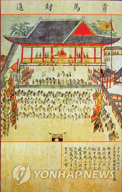 | ▲ 탐라순력도 '공마봉진' (제주=연합뉴스) 조선 숙종 1702년 제주 목사로 부임한 이형상이 화공 김남길에게 남기도록 한 채색 화첩 '탐라순력도'의 그림 중 공마봉진. 이 그림은 조선시대 조정에 진상하기 위해 모은 말을 점검하는 과정이 담겼다. [제주도 제공. 재판매 및 DB 금지] |