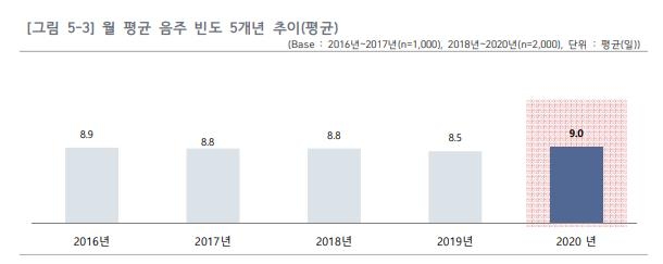 월평균 음주 빈도는 2016년 8.9일에서 2017년과 2018년 각 8.8일, 2019년 8.5일로 감소하다 지난해 반등한 것이다.