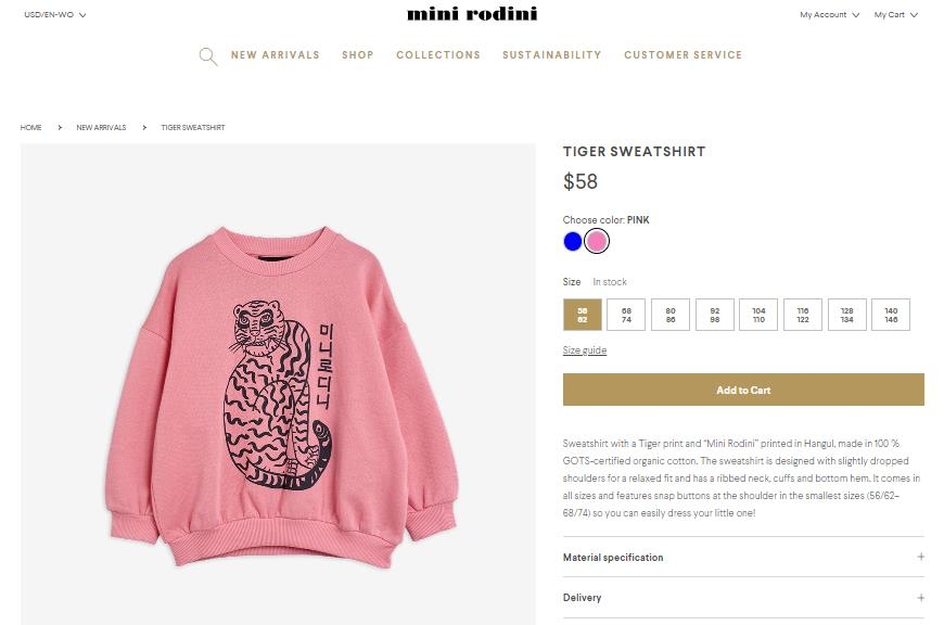 해당 상품은 '시베리아횡단철도를 탄 미니로디니 - 종착역: 서울' 컬렉션으로, 한국 민화를 차용한 듯한 호랑이 그림과 함께 브랜드 이름인 '미니로디니'를 한글로 써넣은 디자인이 대표적이다.
