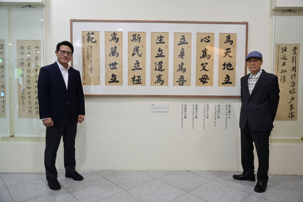 | ▲ 은평한옥박물관에 전시중인 휘호 앞의 정병국 회장(왼쪽)과 김위옹. [기념사업회 제공] |