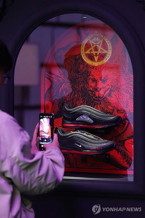 | ▲ "Satan Shoes," a collaboration between MSCHF and rapper Lil Nas X, is on display at Daelim Museum in Seoul on Nov. 8, 2023. (Yonhap) |