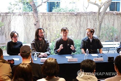 | ▲ MSCHF CEO Gabriel Whaley (3rd from L) speaks during a press conference at Daelim Museum in Seoul on Nov. 8, 2023, two days prior to the opening of the group's exhibition "Nothing is Sacred." (Yonhap) |