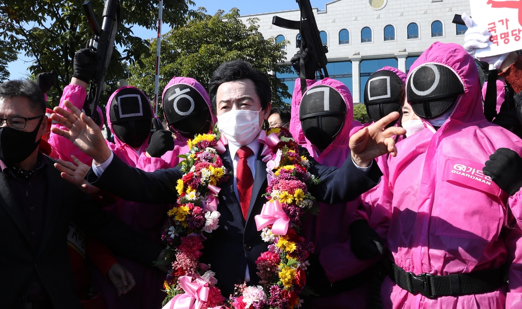 '오징어 게임'은 정치권, 기자회견, 각종 홍보물에서도 뜨거운 인기를 누리고 있습니다.