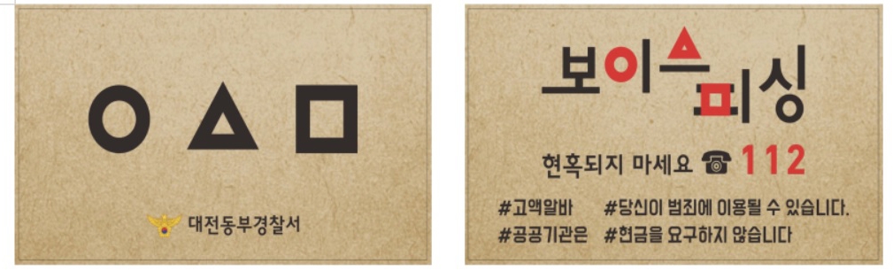 | ▲ '오징어게임' 명함을 패러디해 만든 전화금융사기(보이스피싱) 예방 홍보물 대전 동부경찰서 제공 |