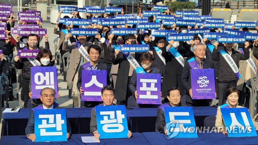 | ▲ "관광도시 부산 엑스포 유치하자" (부산=연합뉴스) 조정호 기자 = 6일 오전 부산역 광장에서 열린 '글로벌 부산, 관광환경 점검단' 발대식에서 참석자들이 결의를 다지고 있다. 2023.3.6 ccho@yna.co.kr |