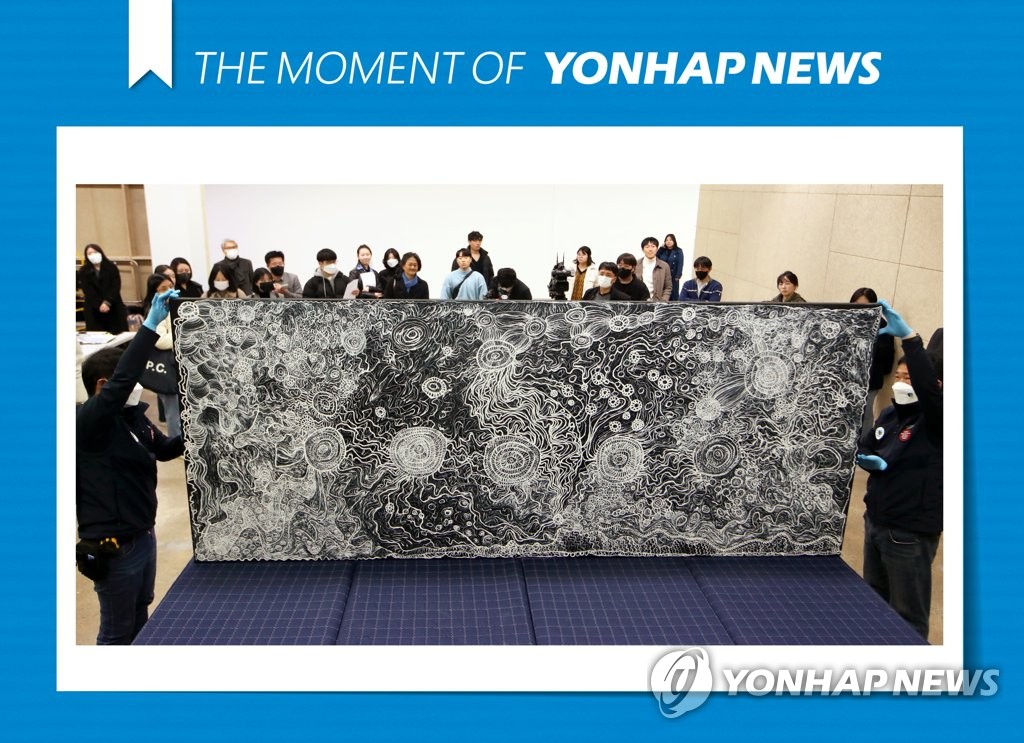 | ▲ [모멘트] 광주비엔날레 첫 반입 작품 해포식 (광주=연합뉴스) 조남수 기자 = 13일 오전 광주 북구 용봉동 광주비엔날레 전시관 3전시실에서 첫 반입 작품인 베티 머플러(Betty Muffler)의 회화 작품 '나라를 치유하다(Healing Country)'가 공개되고 있다. 제14회 광주비엔날레는 '물처럼 부드럽고 여리게'를 주제로 오는 4월 7일부터 7월 9일까지 94일간 열린다. 2023.3.13 [THE MOMENT OF YONHAPNEWS] iso64@yna.co.kr |