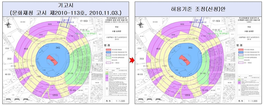 이번에 조정되는 곳은 숭례문 문화재보호구역 경계지표면에서 40∼100m 떨어진 지역이다. 0∼40m 떨어져 숭례문과 인접한 곳은 기존 2구역을 유지한다.