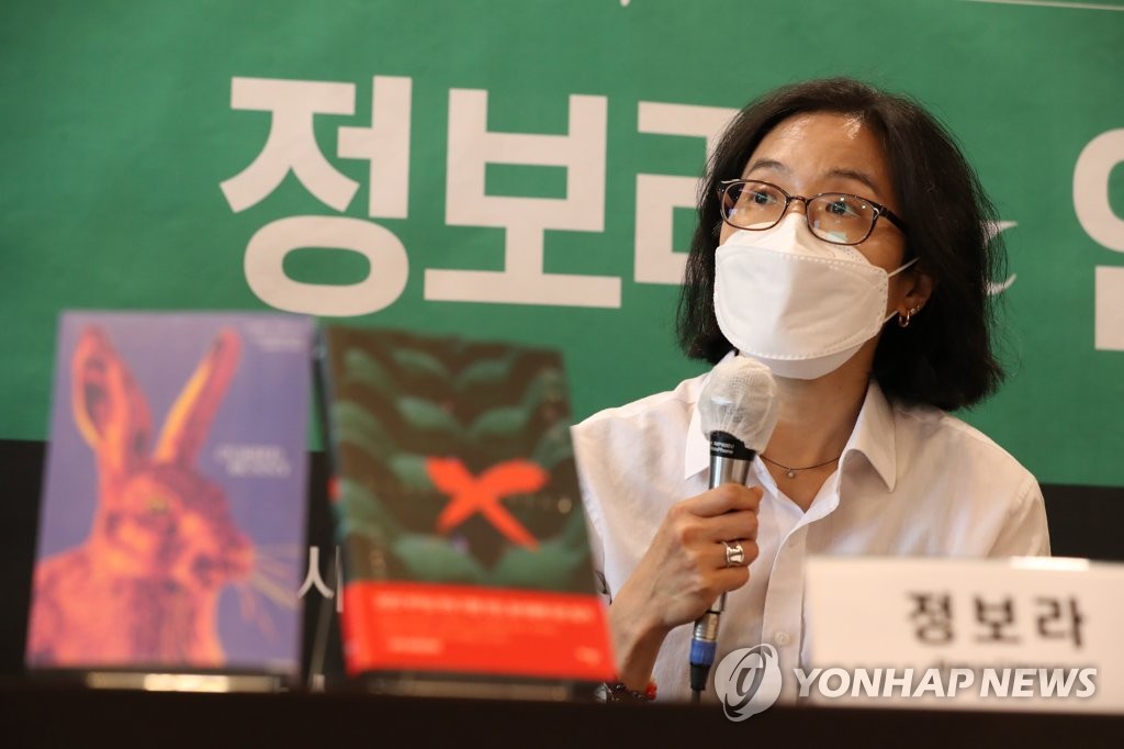 | ▲ 부커상 최종후보 정보라 기자간담회 (서울=연합뉴스) 소설집 '저주 토끼'로 영국 최고 권위의 문학상인 부커상 최종 후보에 오른 정보라 작가가 14일 서울 중구 프레스센터에서 열린 기자간담회에 참석해 있다. 2022.4.14 [재판매 및 DB금지] photo@yna.co.kr |