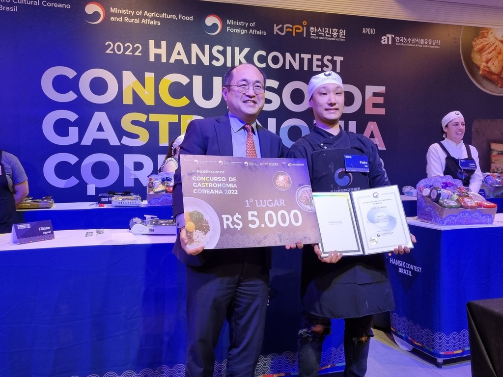 | ▲ 브라질 상파울루서 열린 한식 요리 경연대회 시상식 (상파울루=연합뉴스) 김지윤 통신원= 브라질 상파울루에서 9일(현지시간) 열린 한식 요리 경연대회에서 1위를 차지한 페드루 후씨(오른쪽)가 포즈를 취하고 있다. 2022.10.9 kjy329@yna.co.kr |