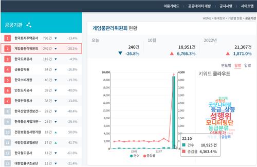 국민권익위가 제공하는 '민원 빅데이터'에 따르면 이달 들어 게임물관리위원회에 제기된 민원 건수는 약 1만9천 건으로, 지난달 대비 무려 4천400% 가까이 폭증했다.