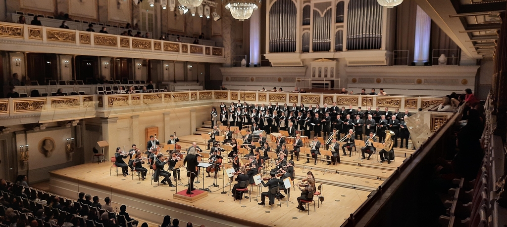 | ▲ 독일 합창단, 대한제국 애국가 한국어로 제창 한국과 독일 음악가들로 구성된 오케스트라와 독일 베를리너 징아카데미 합창단이 대한제국 애국가를 독일에서 처음으로 무대에 올렸다. 베를리너 징아카데미 합창단은 이날 한국어로 애국가를 제창했다.[주독 한국문화원 제공=연합뉴스] |