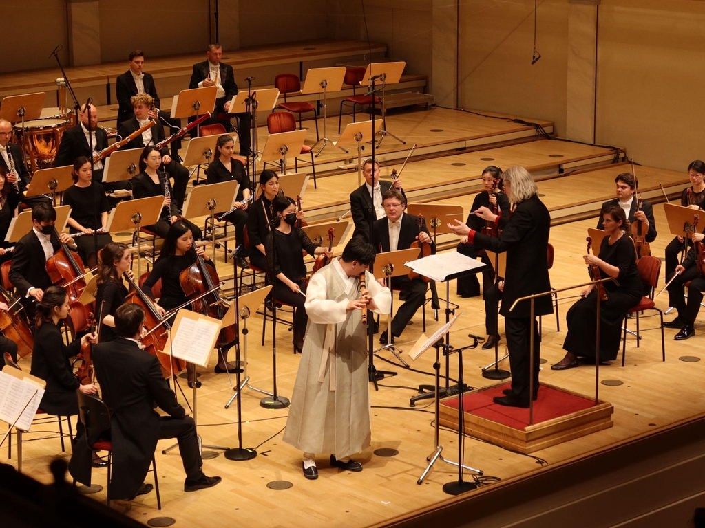 | ▲ '대금과 오케스트라를 위한 혼불Ⅶ-조우' 초연 한독 오케스트라가 작곡가 임준희(한국예술종합학교 전통예술원장)가 작곡한 '대금과 오케스트라를 위한 혼불Ⅶ-조우'를 이아람 서울예술대학교 교수의 대금 협연으로 초연하고 있다.[주독 한국문화원 제공=연합뉴스] |