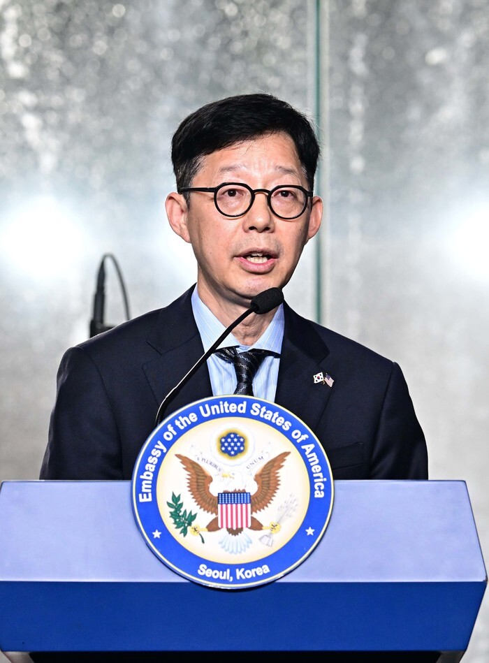 South Korean First Vice Foreign Minister Park Yoon-joo speaks during a reception at a Seoul hotel on July 2, 2025, to celebrate U.S. Independence Day that falls on July 4. (Pool photo) (Yonhap)