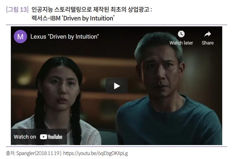 생성형 AI를 활용한 광고 제작 사례로는 IBM 왓슨 AI 시스템이 개발한 스크립트로 제작된 2018년 렉서스 '드리븐 바이 인튜이션'(Driven by Intuition) 캠페인이 있다. 이는 AI가 쓴 대본으로 제작된 최초의 상업광고로 주목받았다.