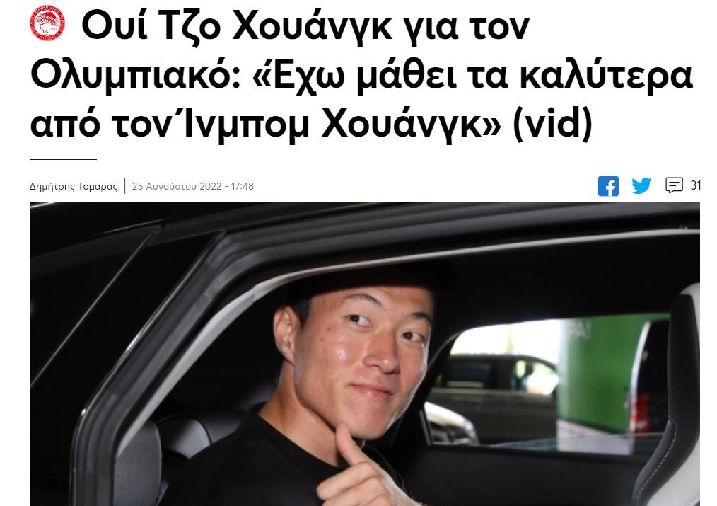 황의조는 이 매체에 "올림피아코스행을 위해 아테네에 와서 기쁘다"며 "황인범에게 이야기를 들었다. 얼른 뛰고 싶다"고 소감을 밝혔다.