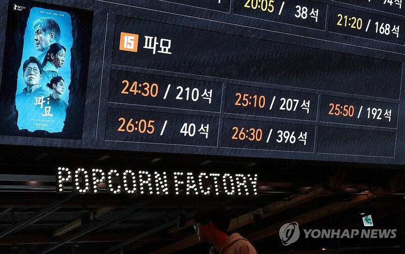 | ▲ '파묘' 상영 중인 영화관 (서울=연합뉴스) 이재희 기자 = '파묘'가 누적 관객 수 1천만명을 돌파한 올해 3월 서울의 한 영화관. 2024.3.24 scape@yna.co.kr |