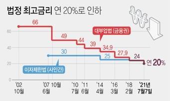 서민들의 이자 부담을 경감한다는 취지로 법정 최고금리를 연 20%까지 낮췄지만, 금리 급등기에는 오히려 서민들의 대출 기회 자체를 박탈하고 있다는 우려에 따른 것이다.