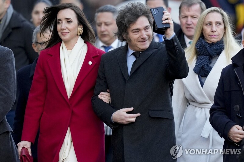| ▲ 비야루엘 부통령(좌), 밀레이 대통령과 카리나 비서실장(우) (부에노스아이레스 AP=연합뉴스) 지난 9일 아르헨티나 독립기념일 군사 퍼레이드에 참여하기 위해 빅토리아 비야루엘 부통령(왼쪽), 하비에르 밀레이 대통령 그리고 그 뒤로 대통령 여동생인 카리나 밀레이 대통령 비서실장이 다른 각료들과 같이 이동하고 있다. photo@yna.co.kr |