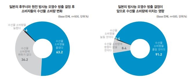 일본의 원전 오염수 해양 방출 결정이 앞으로 자신의 수산물 소비에 미치는 영향에 대해 91.2%가 "소비량을 줄이겠다"고 답해 수산물 소비가 더욱 위축될 것으로 예상된다.