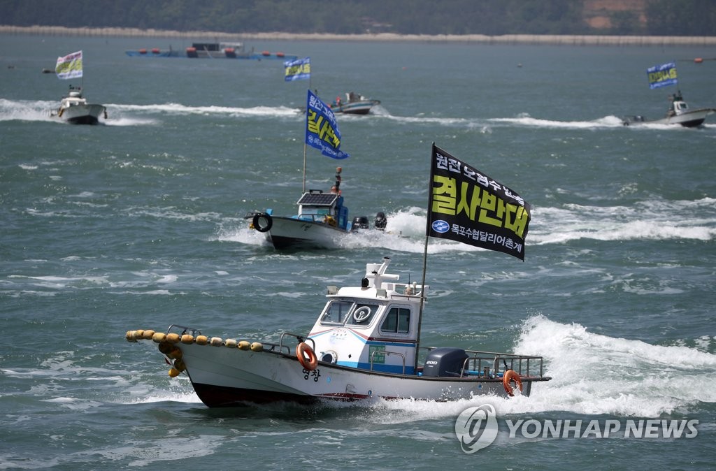 | ▲ 일본 원전 오염수 방출규탄 해상시위 (목포=연합뉴스) 조남수 기자 = 지난달 30일 전남 목포 북항에서 열린 일본의 후쿠시마 원전 오염수 해양방출 규탄대회에서 어선들이 현수막을 걸고 해상 시위를 하고 있다. 2021.4.30 iso64@yna.co.kr |