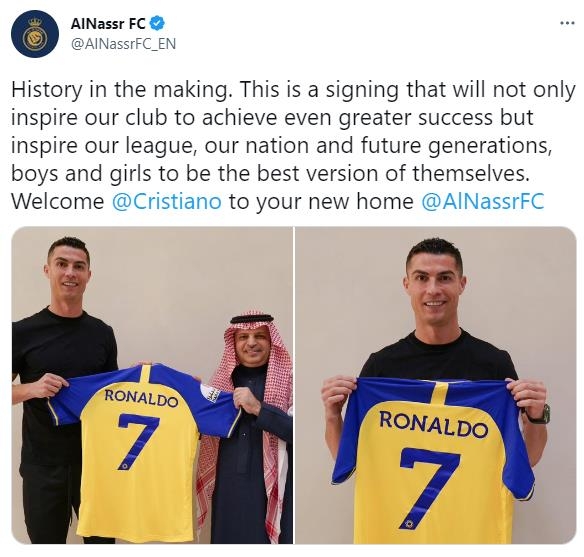 | ▲ 호날두와의 계약을 알리는 알나스르 트위트 [알나스르 트위터 캡처. 재판매 및 DB 금지] |