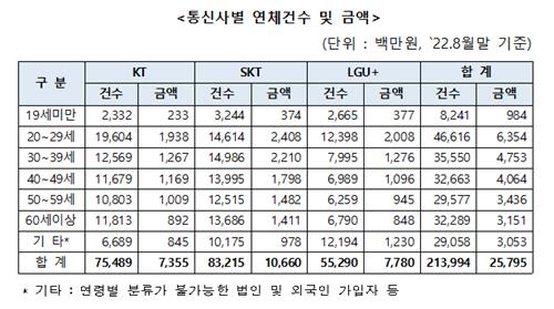 연령별로는 20대의 요금 연체액이 63억5천400만 원으로 가장 많았고, 30대가 47억5천300만 원으로 두 번째였다. 40대(40억6천400만 원), 50대(34억3천600만 원), 60대 이상(31억5천100만 원)이 그 뒤를 따랐다.