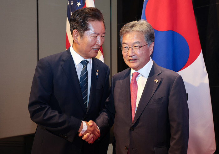 Acting U.S. Ambassador to South Korea Joseph Yun (R) chats with Jung Chung-rai, a lawmaker of the ruling Democratic Party, during a reception at a Seoul hotel on July 2, 2025, to celebrate U.S. Independence Day that falls on July 4. (Pool photo) (Yonhap)