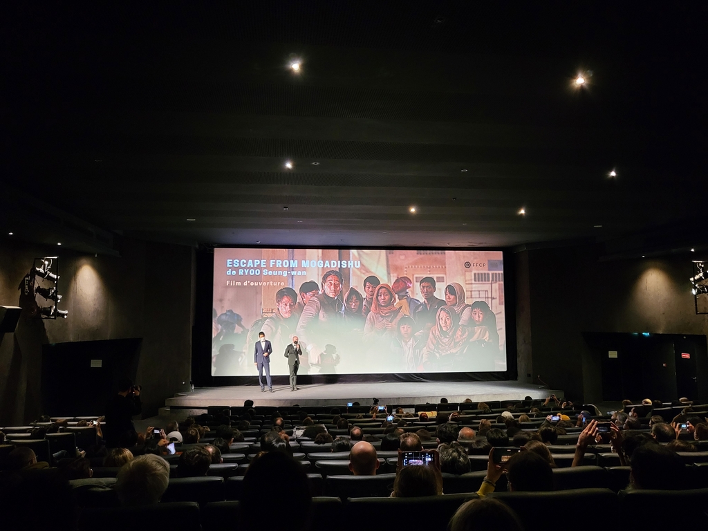 | ▲ 제16회 파리한국영화제 개막식 (파리=연합뉴스) 현혜란 특파원 = 프랑스 파리 샹젤리제 거리 퓌블리시스 극장에서 26일(현지시간) 개막한 제16회 파리한국영화제에서 진행자들이 개막작으로 선정된 류승완 감독의 '모가디슈'를 소개하고 있다. 2021.10.26 runran@yna.co.kr |