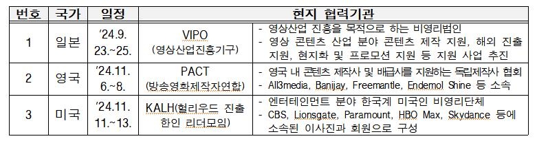 문체부와 콘텐츠진흥원은 미국의 '할리우드 진출 한인 리더모임'(KALH), 영국의 방송영화제작자연합(PACT) 등 현지 기관과 협력해 K-콘텐츠 투자와 협업 의향이 있는 구매자를 모집할 예정이다. 지난해엔 프랑스 파리, 영국 런던, 미국 로스앤젤레스에서 시리즈온보드를 열어 드라마 '유괴의 날'의 영국판 공동 리메이크가 결정되는 등 성과를 냈다.