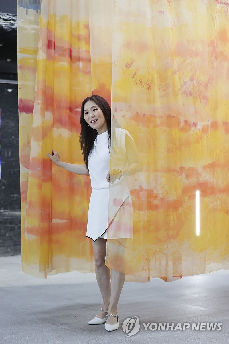 | ▲ 작품 소개하는 장혜진 (서울=연합뉴스) 강민지 기자 = 3일 서울 용산구 프로세스 이태원에서 열린 아트테이너 '뻑:온앤오프' 특별전 간담회에서 가수 장혜진이 작품을 선보이고 있다. 2024.7.3 mjkang@yna.co.kr |