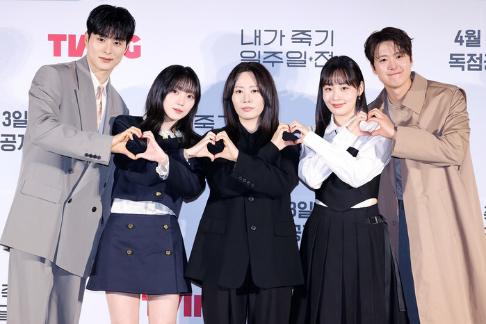 The stars of the TVing's upcoming romantic fantasy "Way Back Love" -- Jung Gun-joo, Oh Woo-ri, Kim Min-ha and Gong Myung (L to R) -- along with director Kim Hye-young (C) -- pose for a photo during a publicity event in Seoul on April 1, 2025. The first episode of the series will be available on April 3. (Yonhap)
