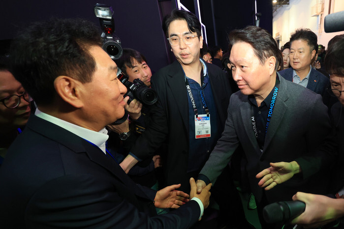 SK Group Chairman Chey Tae-won (R) shakes hands with Han Jong-hee, co-CEO and vice chairman of Samsung Electronics Co., as he visits the booth of Samsung at CES 2025, the world's largest consumer electronics show, in Las Vegas, Nevada, on Jan. 8, 2025. (Yonhap)