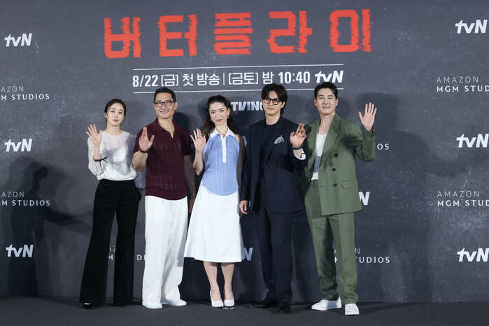 The stars of the TVing's drama "Butterfly" -- Kim Tae-hee, Daniel Dae Kim, Reina Hardesty, Kim Ji-hoon and Sean Dulake (L to R) -- pose for a photo during a publicity event in Seoul on Aug. 21, 2025. The first episode of the drama will be aired by the local cable TV network tvN on Aug. 22. (Yonhap)