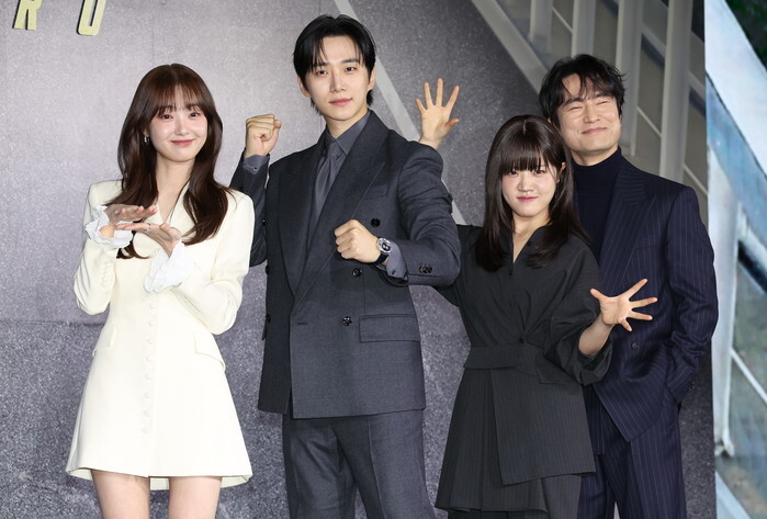 The stars of the drama "Cashero" an original series by Netflix -- Kim Hye-jun, Lee Jun-ho, Kim Hyang-ki and Kim Byung-chul (L to R) -- pose for a photo during a publicity event in Seoul on Dec. 22, 2025. The eight-episode series will be released worldwide on Dec. 26. (Yonhap)