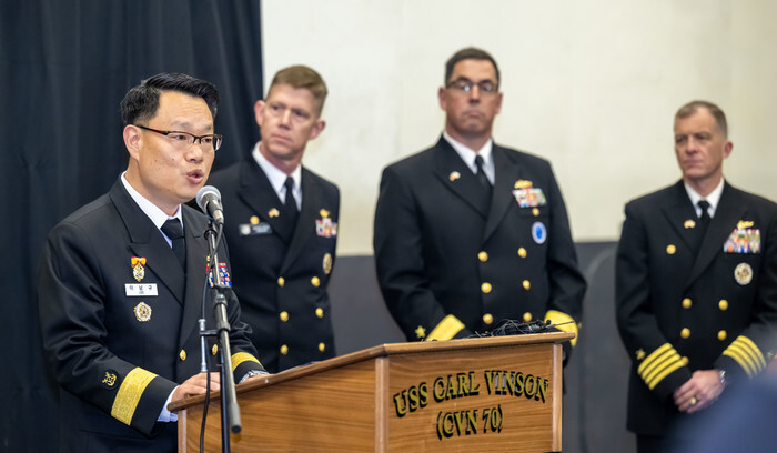 R. Adm. Lee Nam-gyu (L), director of the maritime operation center at the ROK Fleet, speaks during a press conference on the nuclear-powered aircraft carrier USS Carl Vinson at a naval base in the southeastern port city of Busan on March 3, 2025. The warship of the U.S. Navy Carrier Strike Group 1 entered the naval base the previous day in what marked the first such visit by a U.S. aircraft carrier to South Korea since U.S. President Donald Trump's return to the White House in January. (Pool photo) (Yonhap)