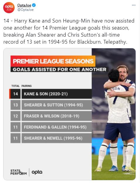 축구 통계전문 사이트 옵타도 트위터 계정을 통해 "케인과 손흥민이 이번 시즌 EPL에서 서로 14골을 합작하며 1994-1995시즌 앨런 시어러와 크리스 서튼이 세웠던 기록(13골)을 깼다"고 전했다.