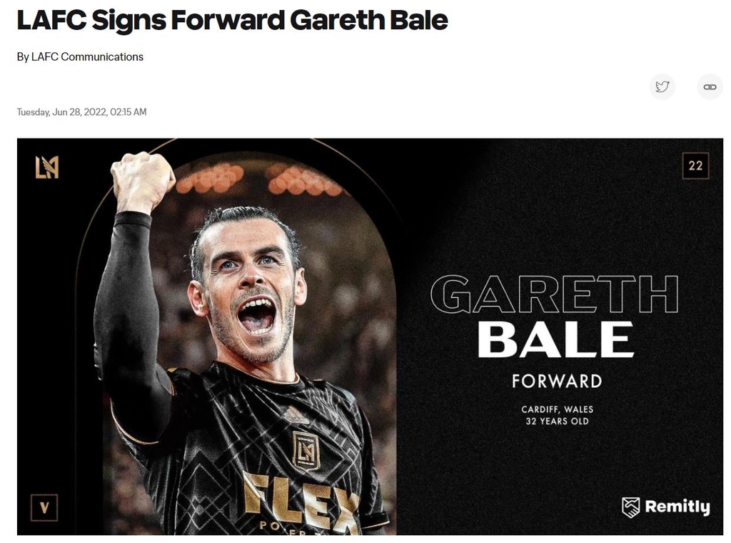 LAFC는 28일(한국시간) "베일과 계약했다. 기간은 1년이며, 2024년까지 연장 가능한 옵션이 포함됐다"고 밝혔다.