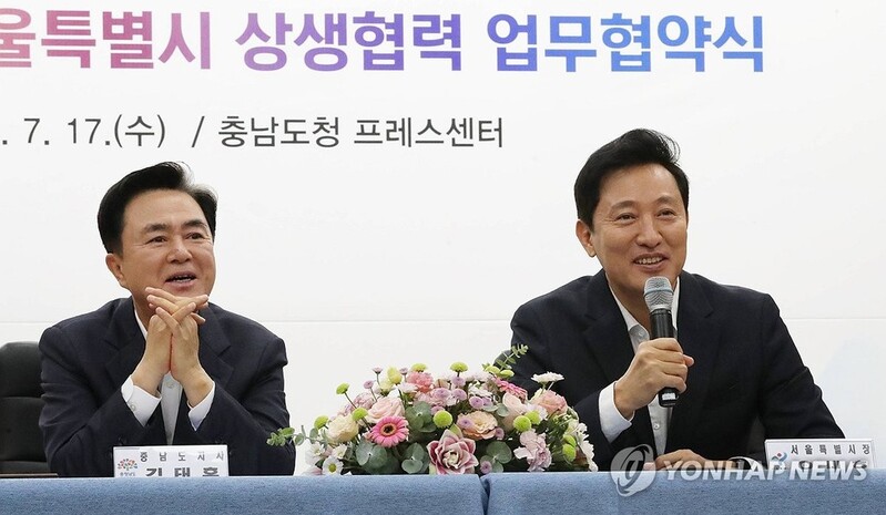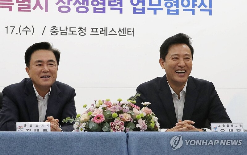 오세훈 서울시장은 17일 충남도청에서 김태흠 충청남도지사와 이런 내용의 '상생발전을 위한 우호교류 강화 업무협약'을 체결했다.
