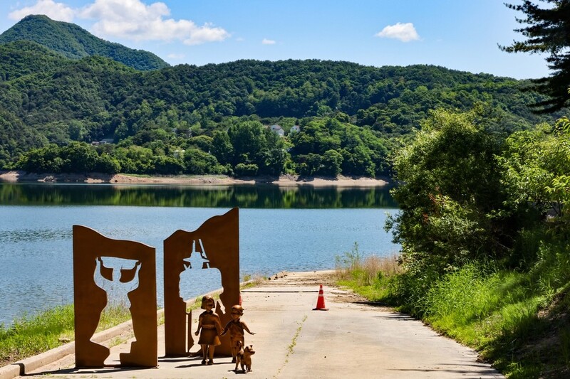호수로 이어진 지점에 놓인 '장터 가는 가족'이라는 브론즈 작품이 눈에 띄었다.