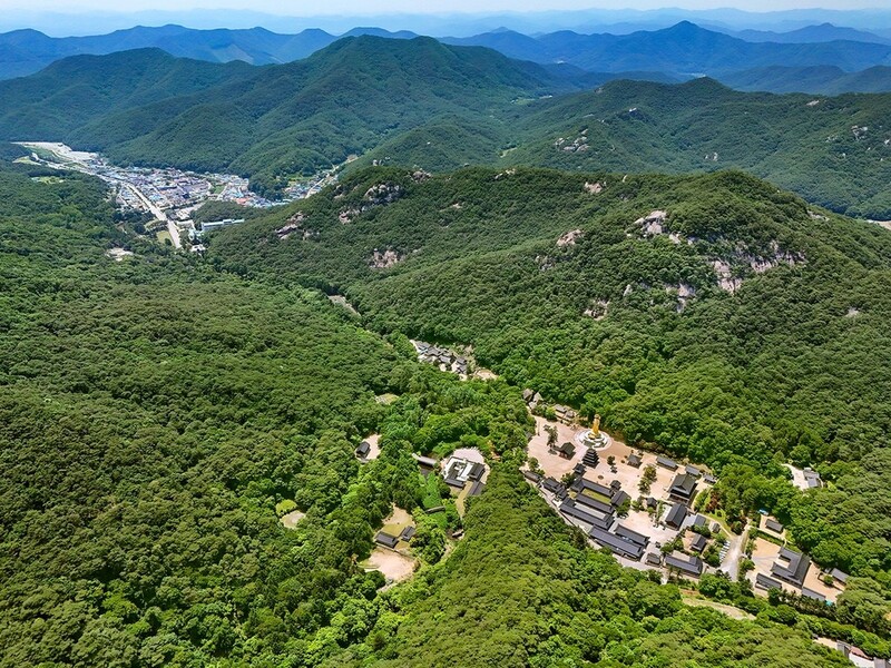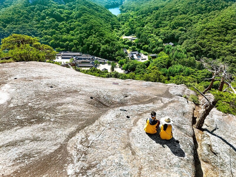 계곡을 낀 넓은 분지에 자리 잡은 법주사 경관도 아찔한 바위 절벽 아래로 펼쳐진다.