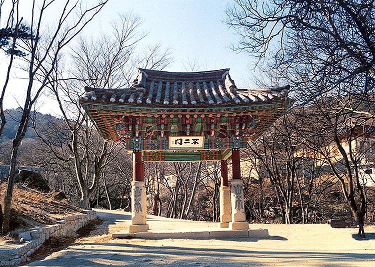 | ▲ 고성 건봉사 불이문(不二門) 한국전쟁 때 폐허가 된 건봉사 절터에 유일하게 남아 있는 건물로, 번뇌의 세계에서 깨달음의 세계로 들어가는 입구를 뜻하는 문이다. [문화재청 국가문화유산포털 제공. 재판매 및 DB 금지] |