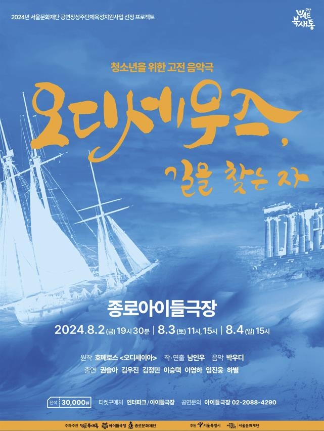 ▲ 청소년 음악극으로 각색된 오디세우스 신화 = 극단 북새통은 다음 달 2∼4일 서울 종로구 아이들극장에서 청소년 음악극 '오디세우스, 길을 찾는 자'를 공연한다. 고대 그리스의 서사시 오디세이아를 각색한 작품으로, 주인공 오디세우스의 모험과 고난의 항해를 담은 신화를 청소년의 감성에 맞게 쉽고 재미있는 음악극의 형태로 풀어냈다. 작곡가 박우디와 연출가 남인우가 제작을 맡았고, 배우 임진웅과 김우진이 출연한다.