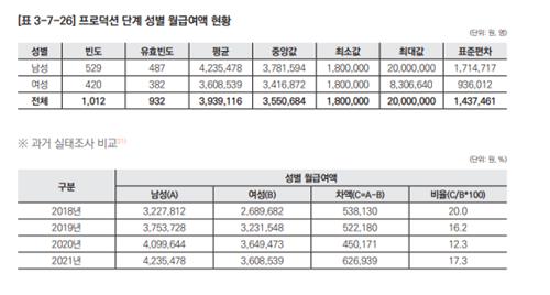 작품을 기획·구성하는 프리 프로덕션 단계의 월평균 급여는 남성이 344만4천324원으로 여성 326만603원보다 18만3천721원(5.6%) 더 많았다. 전년도 남녀 급여 격차는 8만3천443원으로, 격차가 1년 만에 10만 원가량 더 벌어졌다.