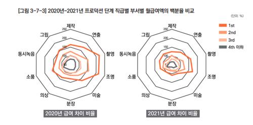 2020년 프로덕션 단계에서 가장 높은 직급(1st)과 가장 낮은 직급(4th) 간 월평균 급여 차이는 부서에 따라 48∼137%였으나, 2021년에는 39∼94%로 좁혀졌다.